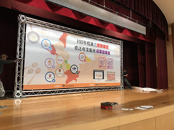 室內活動會場的主視覺,若尺寸比較大,可以選擇用帆布/truss的方式施工,整個視覺效果一樣可以很顯眼,效果不會比背板遜色喔!